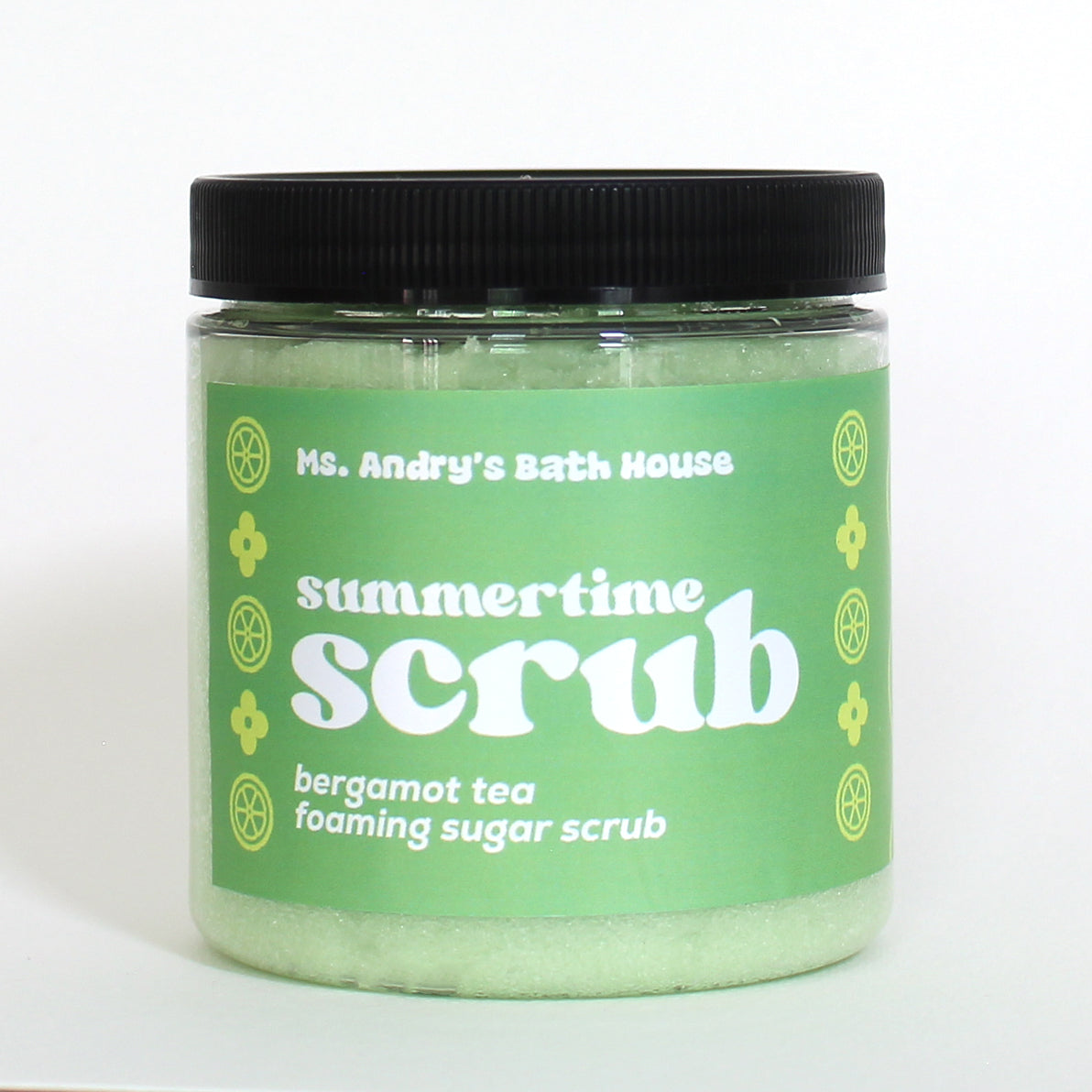 Bergamot Tea Summertime Scrub in the classic Ms. Andry scrub formula. This isn’t your average scrub, it's a cleanser and exfoliator in one. Whipped into a rich, creamy lather, this sugar scrub gently buffs away dry skin while doubling as a cleanser. It leaves your skin fresh, smooth, and clean. Never oily or heavy.