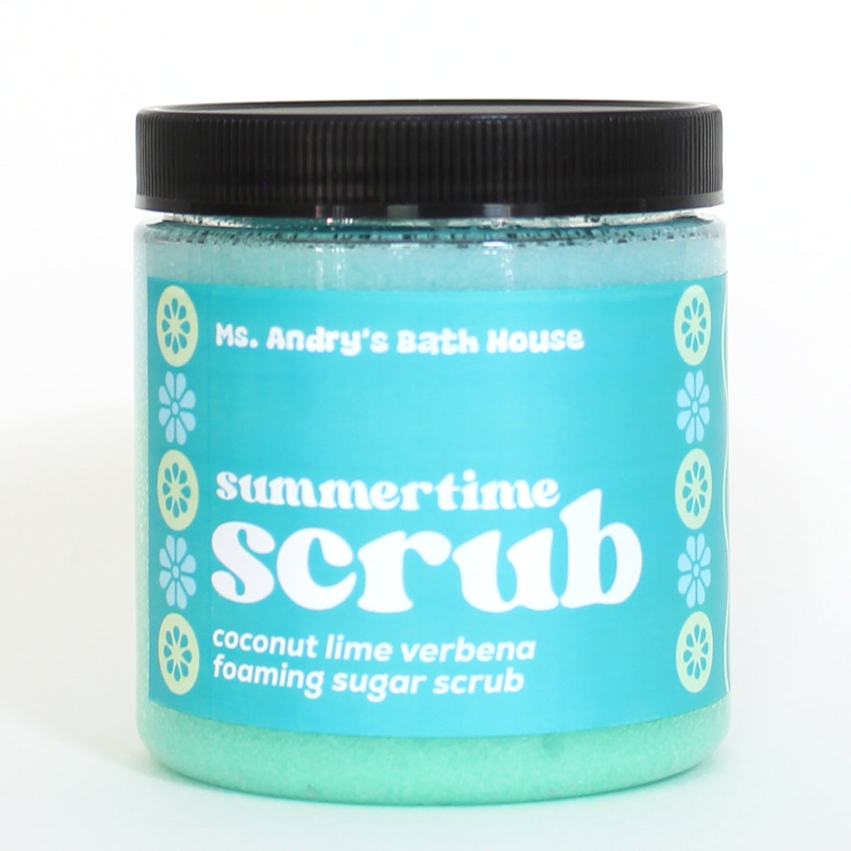 Coconut Lime Verbena Summertime Scrub in the classic Ms. Andry scrub formula. This isn’t your average scrub, it's a cleanser and exfoliator in one. Whipped into a rich, creamy lather, this sugar scrub gently buffs away dry skin while doubling as a cleanser. It leaves your skin fresh, smooth, and clean. Never oily or heavy.