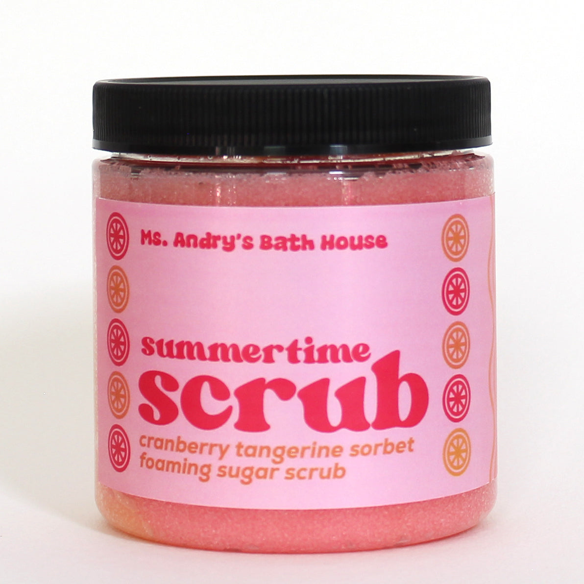 Cranberry Tangerine Sorbet Summertime Scrub in the classic Ms. Andry scrub formula. This isn’t your average scrub, it's a cleanser and exfoliator in one. Whipped into a rich, creamy lather, this sugar scrub gently buffs away dry skin while doubling as a cleanser. It leaves your skin fresh, smooth, and clean. Never oily or heavy.