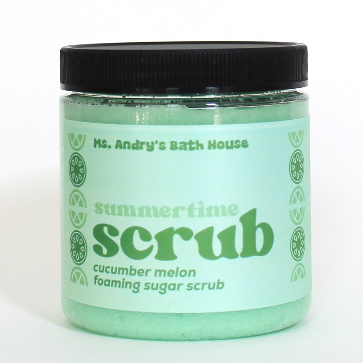 Cucumber Melon Summertime Scrub in the classic Ms. Andry scrub formula. This isn’t your average scrub, it's a cleanser and exfoliator in one. Whipped into a rich, creamy lather, this sugar scrub gently buffs away dry skin while doubling as a cleanser. It leaves your skin fresh, smooth, and clean. Never oily or heavy.