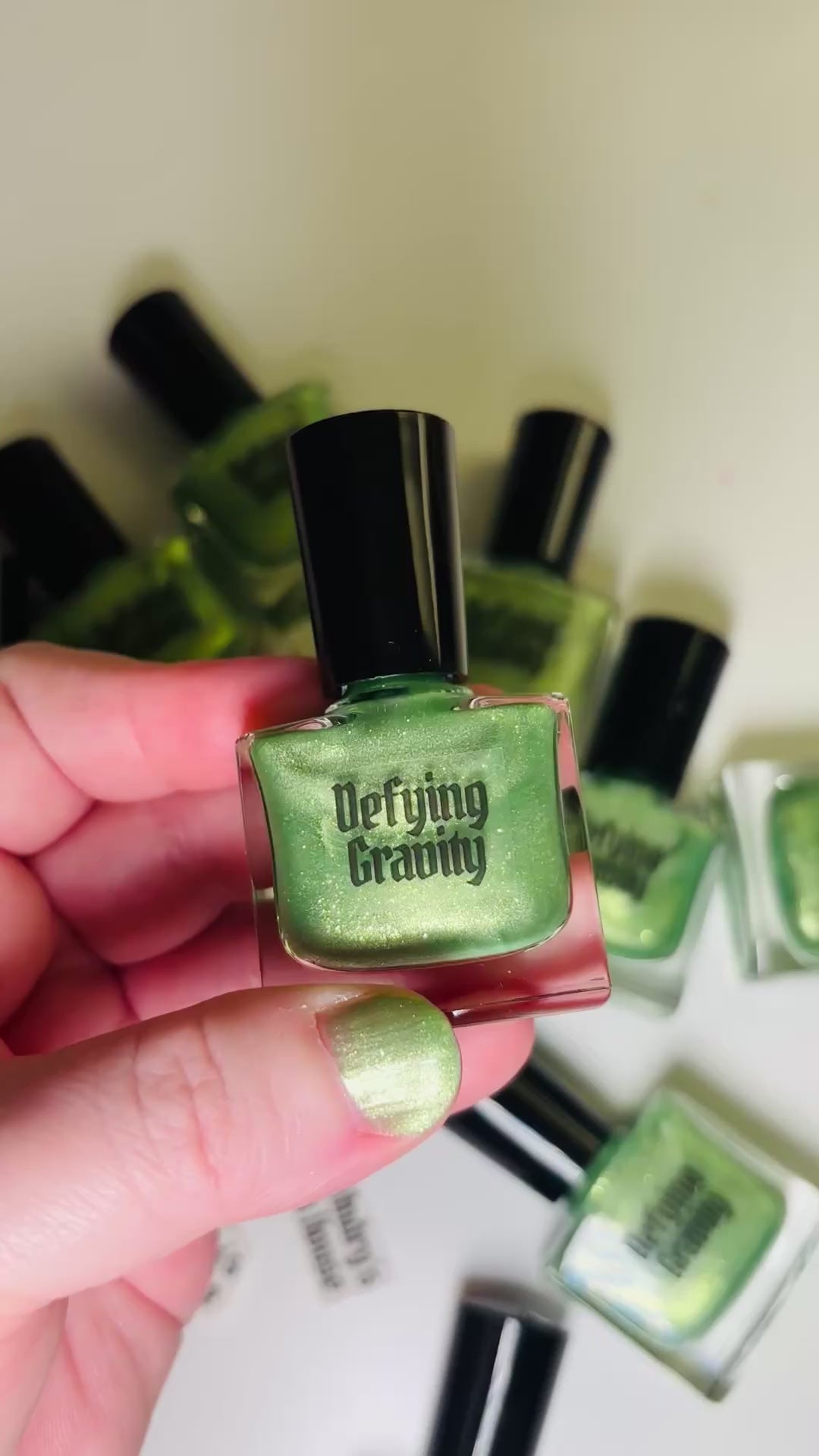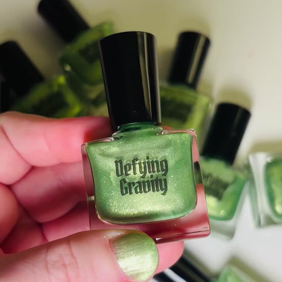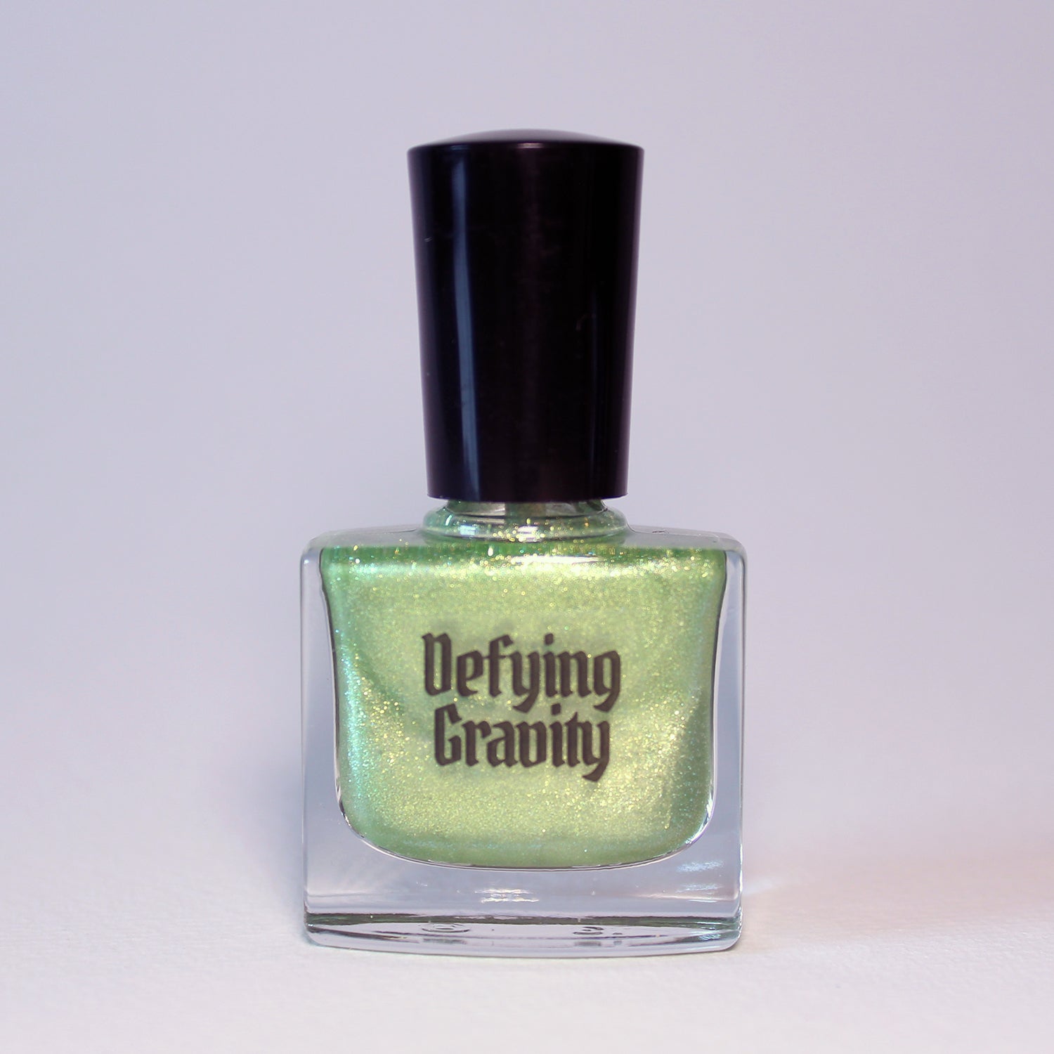 No one is ever gonna bring you down! Defying Gravity is a bold green apple shade with bits of gold shimmer. Pairs perfectly with our Popular polish!