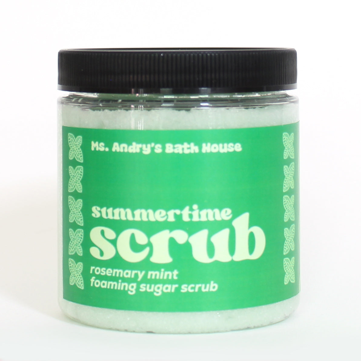 Rosemary Mint Summertime Scrub in the classic Ms. Andry scrub formula. This isn’t your average scrub, it's a cleanser and exfoliator in one. Whipped into a rich, creamy lather, this sugar scrub gently buffs away dry skin while doubling as a cleanser. It leaves your skin fresh, smooth, and clean. Never oily or heavy.