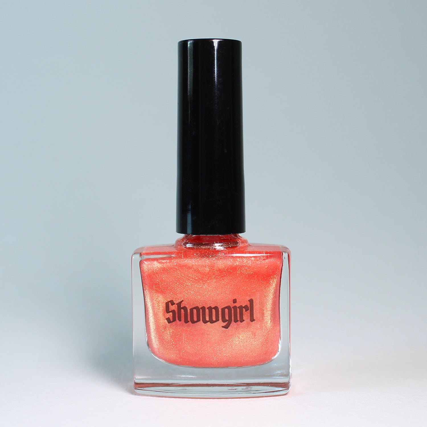 Catchy lyrical marketing phrase pending! Showgirl nail polish is a showstopping orange-coral shade with gold shimmer.