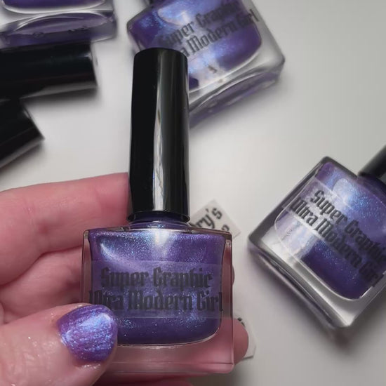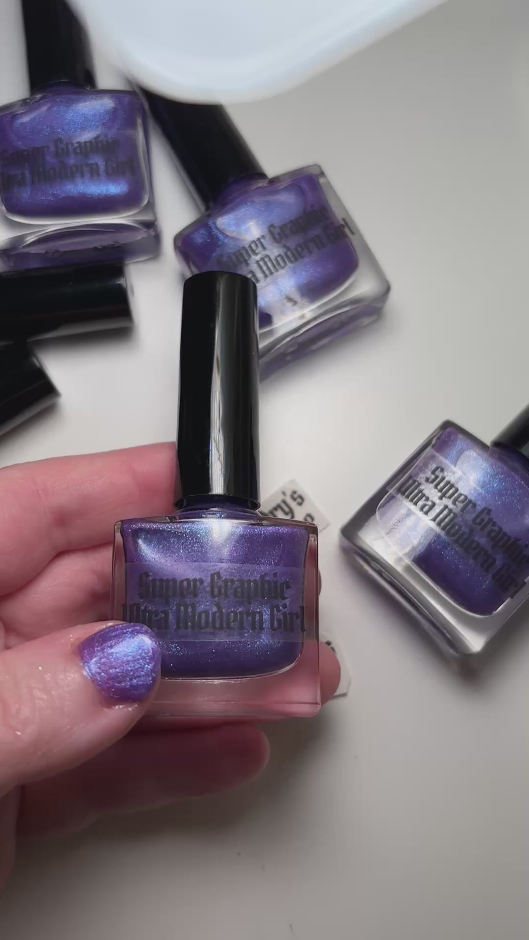 We're leaving the planet and you can't come! Super Graphic Ultra Modern Girl nail polish is a purple base with blue highlight and studded with silver and purple eco glitter. Really witchy and magical.