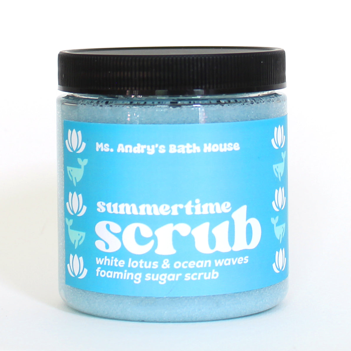 Piper, yes! White Lotus & Ocean Waves Summertime Scrub in the classic Ms. Andry scrub formula. This isn’t your average scrub, it's a cleanser and exfoliator in one. Whipped into a rich, creamy lather, this sugar scrub gently buffs away dry skin while doubling as a cleanser. It leaves your skin fresh, smooth, and clean. Never oily or heavy.
